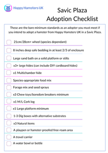 Here are our species-specific checklists with the minimum care standards adopters must provide to adopt a hamster from Happy Hamsters UK. Please note that you may need to provide more than this depending on the size of your enclosure. Scroll further for enclosure-specific checklists.